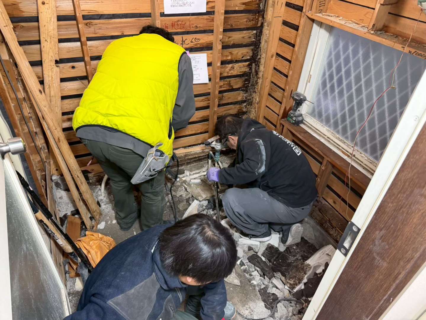 みんなで腐食した木材を取り除きます。