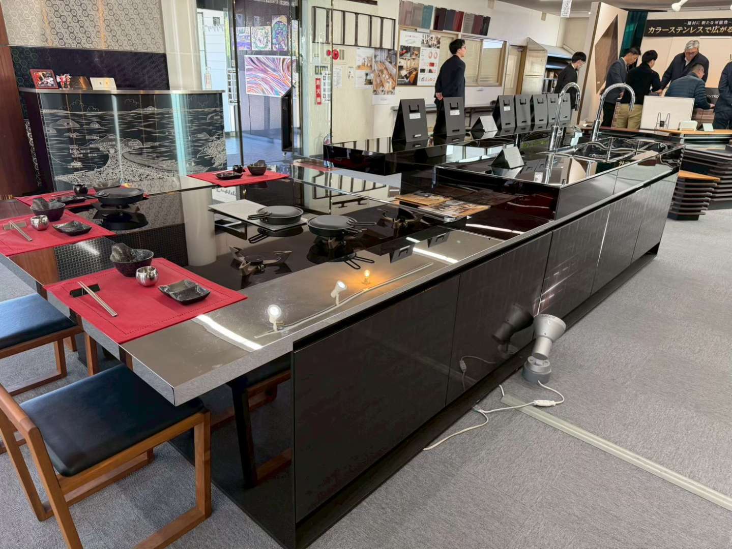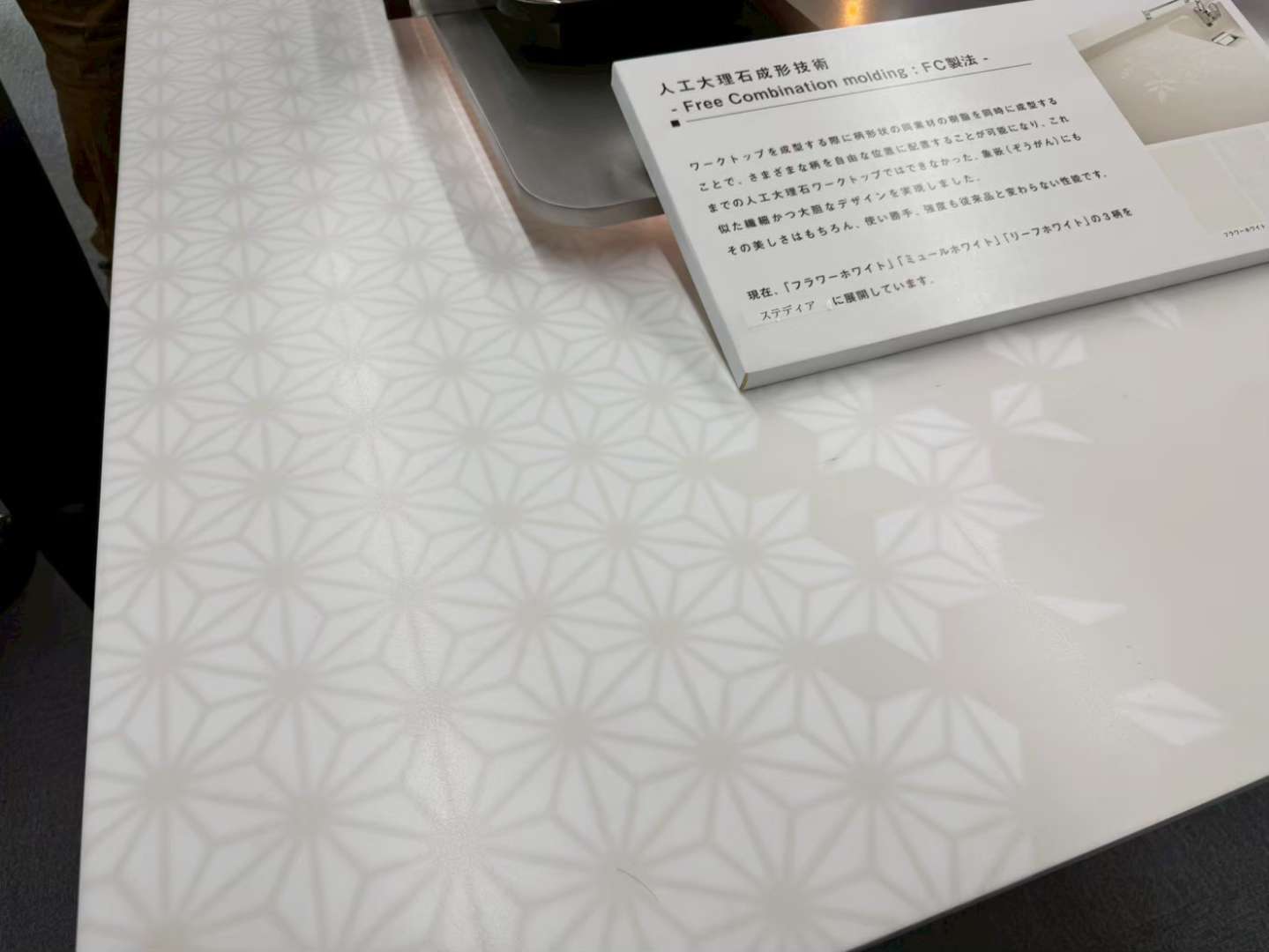 また、ワークトップの加工技術(写真4枚目)も圧巻でした。人工大理石の成形技術では、繊細な柄を自在に配置できるそうで、お手入れのしやすさと美しさを両立させています。