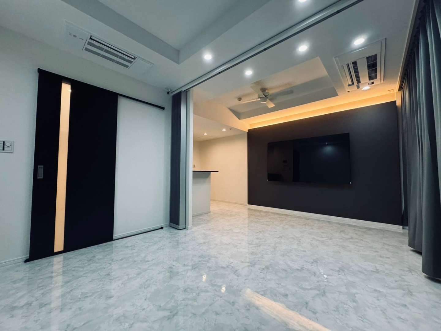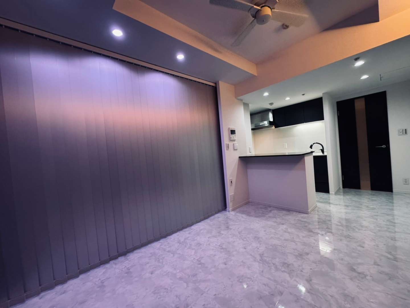 元々のフローリングの床は部屋ごとにデザインが異なっていましたが、人工大理石に統一したことで、空間全体に一体感が生まれました。夜景をバックにリッチな写真が撮れそうです~