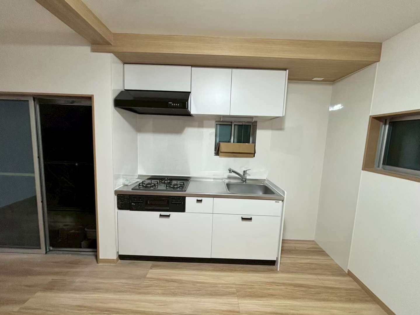 機能美あふれるキッチン: 以前の面影を感じさせない、真っ白で清潔感のあるシステムキッチンを導入しました。対面風のレイアウトにすることで、家族との会話も弾みます。