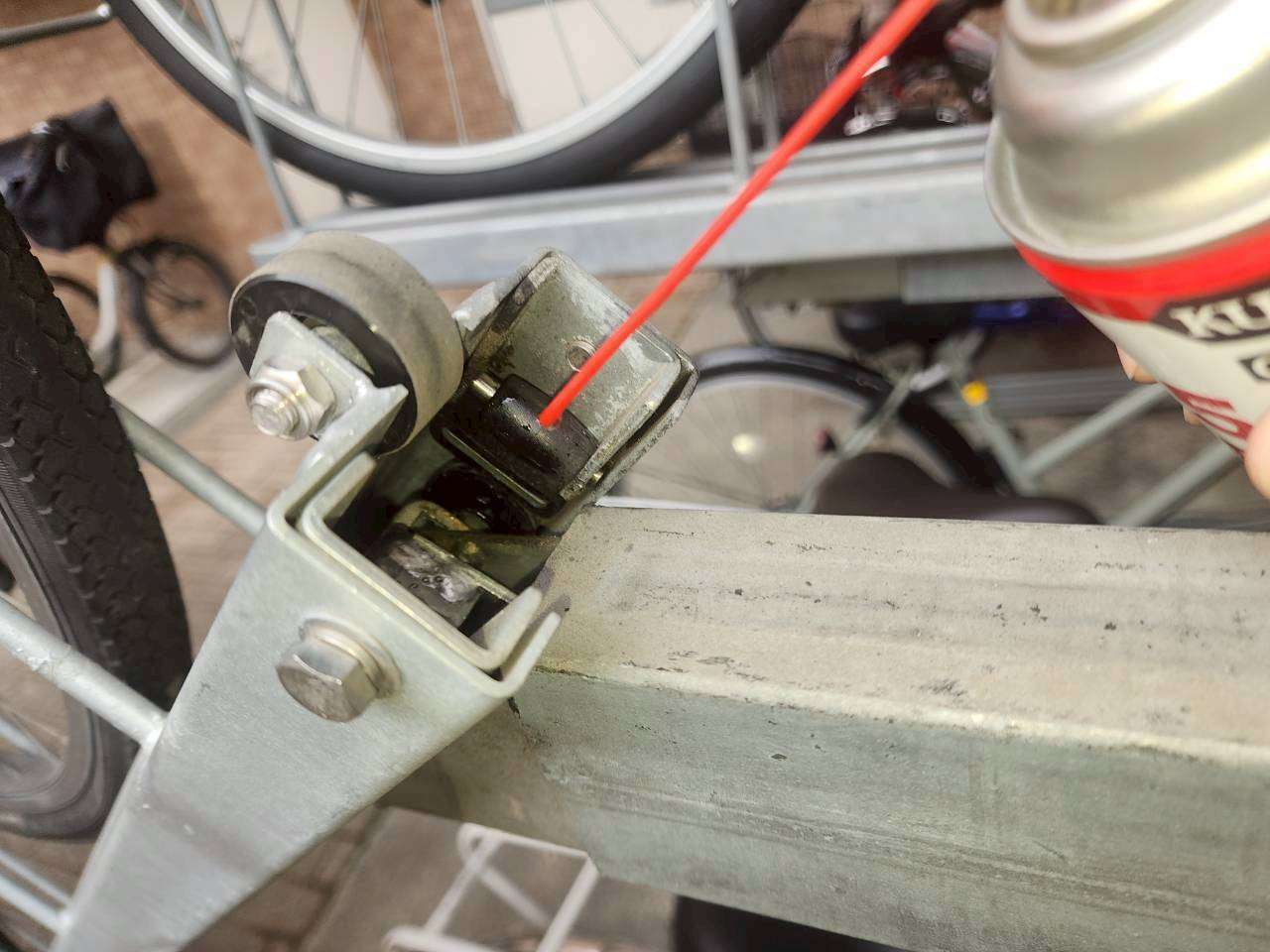 こういった駐輪ラックのローラーは、経年劣化で摩耗しやすいパーツです。普段は目立たない箇所ですが、ここがスムーズに動くかどうかで「駐輪場の使いやすさ」が大きく変わります。