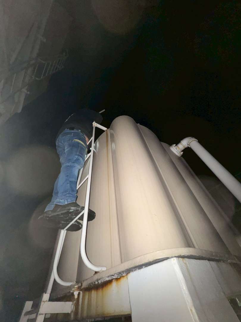 深夜のビルの屋上の給水タンクを除くスタッフ。