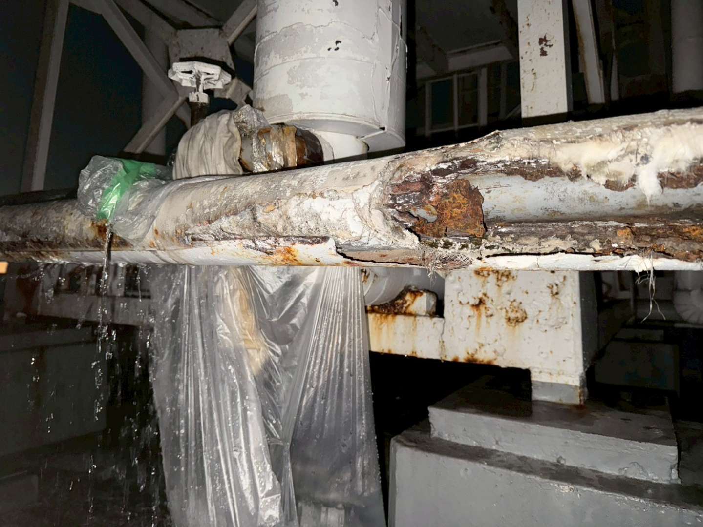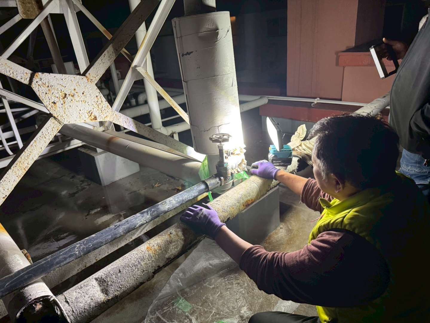 さて、どうしたものか、と水道管と対峙するスタッフ。